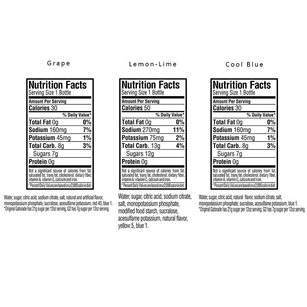 Gatorade Wide Mouth Cool Blue, 20 Fl Oz (pack of 8) Pack of 8, 20 ounce Bottles ; 130 calories per 20 oz. Bottle ; 34g carbohydrates per 20 ounce Bottle: gatorade thirst quencher's carb-to-fluid ratio is tailor-made for efficiency, rehydrating rapidly and feeding muscles with their preferred fuel, carbs ; Replenishes better than water ; Trusted by some of the world's best athletes Gatorade Blue Nutrition Facts • MyFoodDiary® Nutrition information for Gatorade Blue. Track calories, carbs, fat, and 18 other key nutrients. Start your food diary today! Toggle navigation ... Nutrition Facts. 80 calories. Log food: Gatorade G2 Cool Blue Thirst Quencher. 20 fl oz. Nutrition Facts. 50 calories. Log food: Gatorade Cool Blue Prime Energy Chews. 6 chews (30g) Nutrition Facts ...