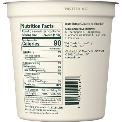 Products - Chobani® Our expert team crafts each of our Chobani products with the highest quality ingredients, to ensure it not only tastes delicious but is also good for you. Pots It takes 3 cups of wholesome Australian milk to craft 1 cup of our authentic Chobani® Greek Yogurt. Chobani Non-Fat Plain Greek Yogurt - Shop Yogurt at H-E-B Preparation instructions Keep refrigerated. Ingredients Cultured Nonfat Milk (Fair Trade Certified by Fair Trade USA), 6 Live and Active Cultures: S. Thermophilus, L. Bulgaricus, L. Acidophilus, Bifidus, L. Casei, and L. Thamnosus. Actual product packaging and materials may contain more or different information than that shown on our website.