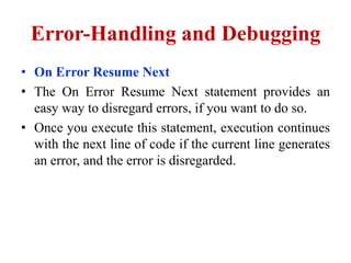 Error Handling in VBScript - Automated-360 on error goto 0 End if End function In Visual Basic, we have two more methods available for error handling On Error Goto Line - Moves the control to a particular line number. On Error Goto Label - Moves the control to a particular section of code which is defined in a label. These two methods are not available in VBScript.