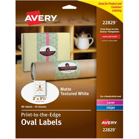 Avery® 22829 2" x 3 1/3" White Matte Textured Print-to-the-Edge Easy ... Personalize shipped orders, gift-wrapped packages, and other business products with these Avery® 22829 white matte easy peel oval labels. Printable and customizable, these labels are compatible with both laser and inkjet printers. They also accept ink to their very edges, meaning that your business designs aren't ended prematurely and automatically bordered with white space. For your ...