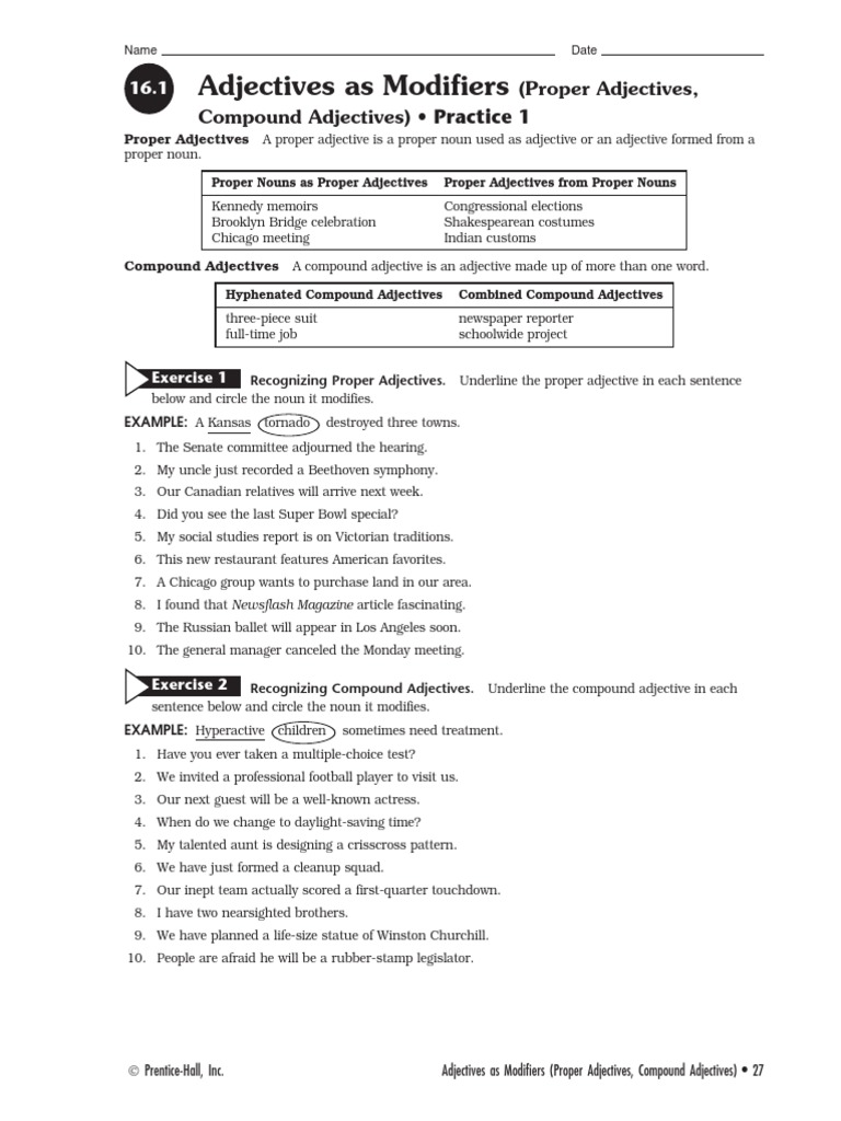 What are Proper Adjectives? Definition, Examples, Rules, and Worksheets ... For proper adjectives with hyphenated forms, only the proper adjective is capitalized. Example: You should have taken a French-speaking guide. Proper Adjectives Worksheets. It will be interesting to solve the following Proper Adjectives Worksheets. Proper Adjectives Worksheet 1: Underline the proper adjectives in the following sentences.