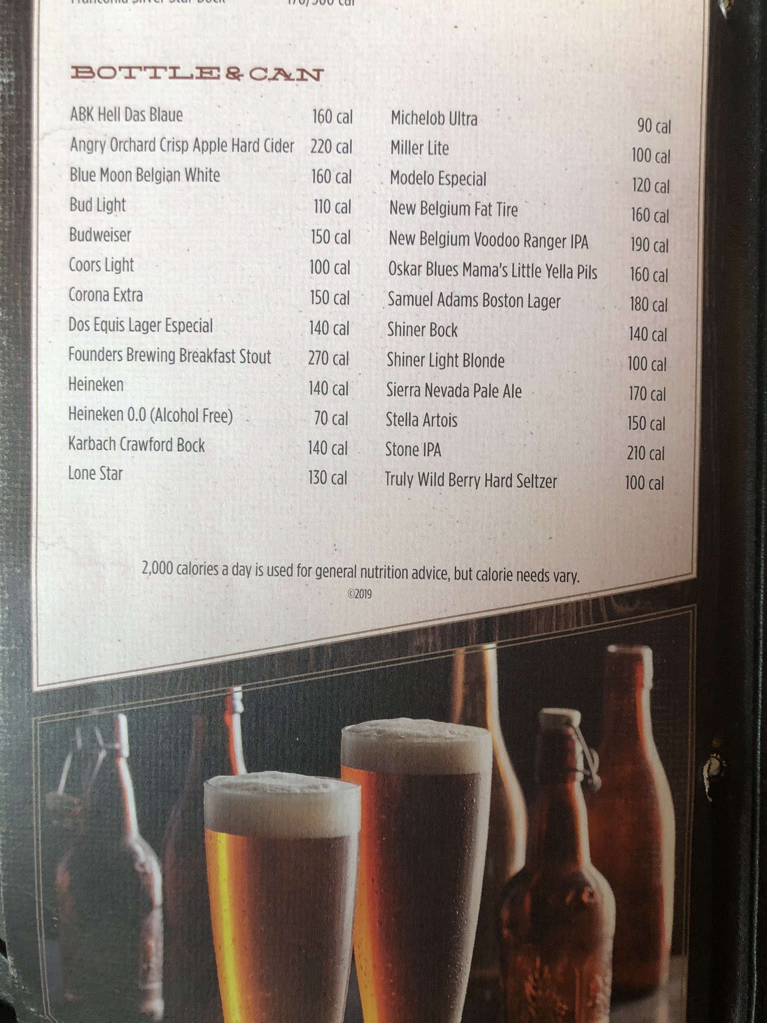 PDF LH - 06.06.22 - Master Nutritional Guide - LongHorn Steakhouse and changes in recipes, ingredients and kitchen procedures, variations between the nutrition reported here and what is actually served may occur. Not all menu items listed in this guide are available at all LongHorn® Steakhouse locations. ... BEER House Golden Ale 16 oz. 200 0 0 0 0 0 20 16 0 0 0 House Golden Ale 20 oz. 250 0 0 0 0 0 25 20 0 0 0