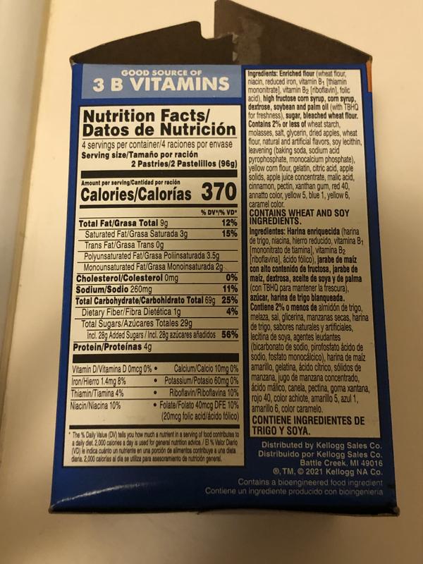 Frosted Strawberry Pop-Tarts® | Pop-Tarts® Ingredients: Enriched flour (wheat flour, niacin, reduced iron, vitamin B1 [thiamin mononitrate], vitamin B2 [riboflavin], folic acid), corn syrup, high fructose corn syrup, dextrose, soybean and palm oil (with TBHQ for freshness), sugar, bleached wheat flour. Contains 2% or less of wheat starch, salt, dried strawberries, dried pears, dried apples, leavening (baking soda, sodium acid pyrophosphate, monocalcium phosphate), citric acid, gelatin, modified wheat starch, yellow corn flour ...