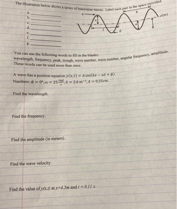 Label the parts of a wave the terms - Brainly.com From the question we are told Label the parts of a wave the terms : crest ,trough, frequency, wavelength, amplitude Generally Crest This is the defined as the vertical distance covered by a wave. Trough This speaks of lowest point of a wave the inverse of the crest Frequency This is the is defined as the inverse of Wavelength