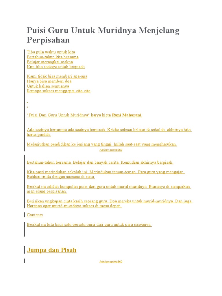 #Kumpulan puisi guru tercinta dan puisi dari guru untuk murid ... Oct 8, 2018 · Monday, October 08, 2018. Kumpulan puisi guru tercinta dan puisi dari guru untuk murid di hari guru. Setelah puisi tentang perpisahan sekolah yang berkaitan dengan puisi pendidikan maka kali ini masih berkaitan dengan tema pendidikan yaitu puisi tentang guru tercinta yang terbaik dan kata kata puisi dari guru untuk murid di hari guru. 30 Kata-Kata Perpisahan Sekolah Menyentuh Hati, Wajib Kamu ... Apr 3, 2023 · 3 Contoh Kata Sambutan Perpisahan Sekolah Dasar, SMP & SMA 30 Ucapan Selamat Tinggal Masa Lalu, Penuh Makna dan Menyentuh Hati. 10. Pendidikan tidak menghentikan Anda dari membuat kesalahan tetapi menginspirasi Anda untuk mengambil pelajaran dari kesalahan Anda. Selamat berpisah murid-murid terkasih! +60 Kata Ucapan Untuk Guru Kenaikan Kelas - venerana.eu.org Ucapan selamat ulang tahun untuk guru pada quotes di atas menyelipkan kata dalam bahasa arab di dalamnya. 25 kata kata perpisahan yang menyentuh hati untuk guru 2022 poskata. Source: nusagates.com May 03, 2022 · berikut adalah contoh puisi perpisahan kelas 6 tentang guru, sekolah, maupun.